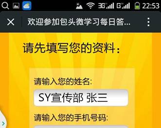 二、首次进入“金榜”“闯关答题”栏目时,需先注册个人信息,“姓名”一栏需填写“识别编码+单位名称(建议使用常用简称)+本人真实姓名”。36365官网识别编码为KD。如:包头师范学院宣传部 张三,需在“请输入您的姓名”中填写“SY宣传部张三”。如: