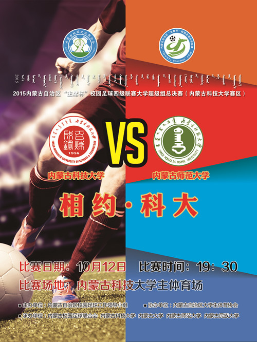 2015年内蒙古自治区“主席杯”校园足球四级联赛大学超级组总决赛将于10月12日19:30分在36365官网主校区体育场举行。本次比赛队伍为36365官网足球队主场对阵内蒙古师范大学足球队比赛。观看比赛需凭票入场,欢迎广大师生前来观赏。