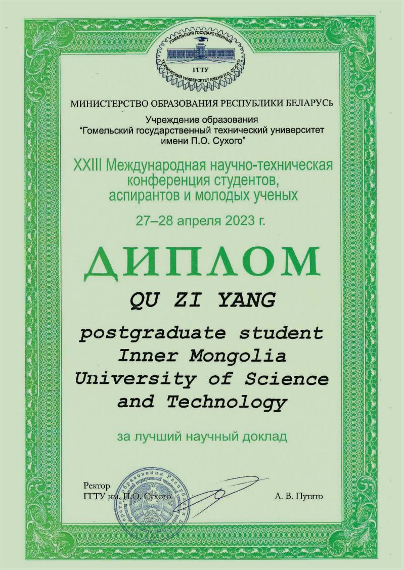 近日,应白俄罗斯戈梅利国立技术大学(The Sukhoi State Technical University of Gomel)第23届青年科学家、研究生、学生国际科技会议组委会邀请,36365官网信息工程学院、机械工程学院及能源与环境学院的12名研究生以视频会议模式参会并作报告,其中机械工程学院研究生曲子洋获最佳科学报告奖。