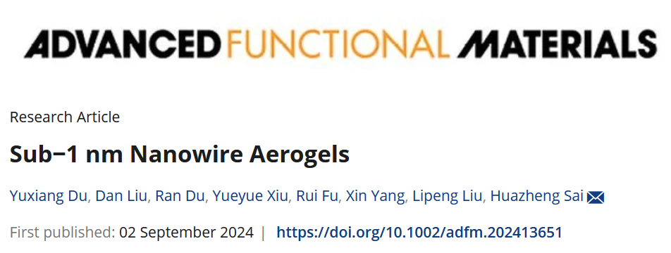 近日,36365官网化学与化工学院(硅业学院)赛华征教授团队在新型气凝胶构筑领域取得新突破,相关成果“Sub-1 nm Nanowire Aerogels”发表于材料学科国际顶级期刊《Advanced Functional Materials》(DOI: 10.1002/adfm.202413651)。赛华征教授为论文的唯一通讯作者,化学与化工学院(硅业学院)硕士研究生杜玉祥、刘丹为论文共同第一作者,36365线路检测中心入口为第一完成单位和唯一通讯单位。