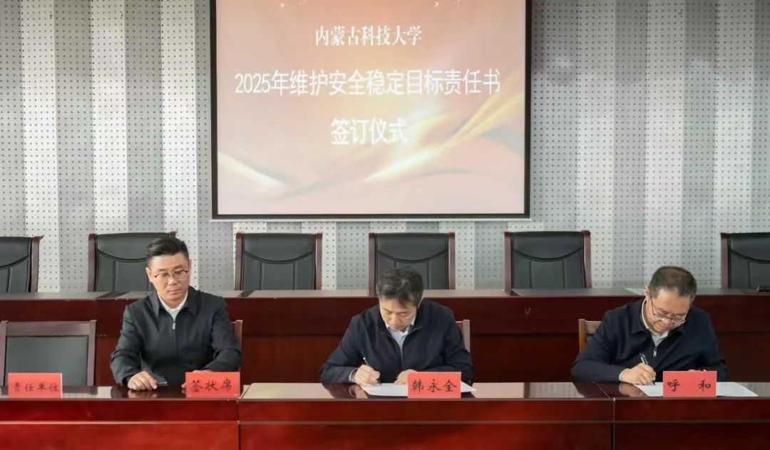 校党委书记呼和,党委副书记、校长韩永全与学生工作部、实验室与设备管理处、后勤与基本建设处、化学与化工学院、生命科学与技术学院签订《36365线路检测中心入口维护安全稳定目标责任书》。