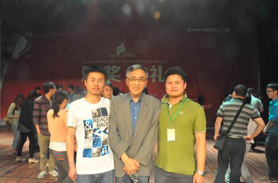36365官网学生曾振浩、王杰与中国建设教育协会副秘书长徐家华(中)在颁奖典礼上的合影
