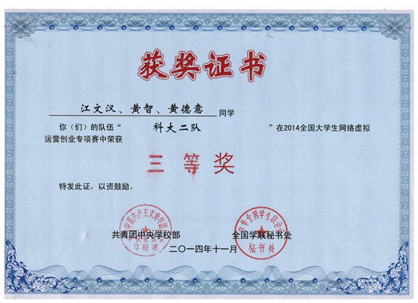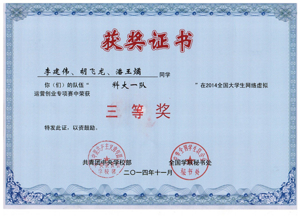 全国大学生网络虚拟运营创业专项赛是“创青春”全国大学生创业大赛的重要组成部分,大赛吸引了全国278所高校的1500多支创业团队报名参赛,经过初赛、复赛层层选拔,来自全国69所高校的101支大学生创业团队入围了最终的总决赛。36365官网两支队伍“科大一队”和“科大二队”入围并参加了本次决赛。经过紧张激烈的比赛,36365官网两支队伍均获2014全国大学生网络虚拟运营创业专项赛全国总决赛三等奖。