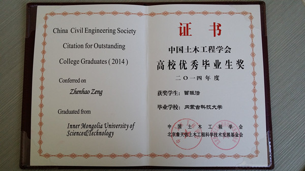 中国土木工程学会高校优秀毕业生奖由中国土木工程学会于1989年设立,旨在表彰奖励在高校本科期间主修土木工程专业(包括工程管理专业)品学兼优的优秀毕业生。由中国土木工程学会教育工作委员会组织评选,每年评选一次。2014年全国工程管理专业共有15名同学获此称号。