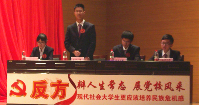活动在“辩人生常态展党校风采”辩论赛总决赛中拉开帷幕,来自党校六班和七班的选手就当代社会大学生更应该培养民族自豪感还是民族危机感展开了激烈的辩论,经过一番唇枪舌战,最终党课七班代表队胜出,获得总决赛的冠军。
