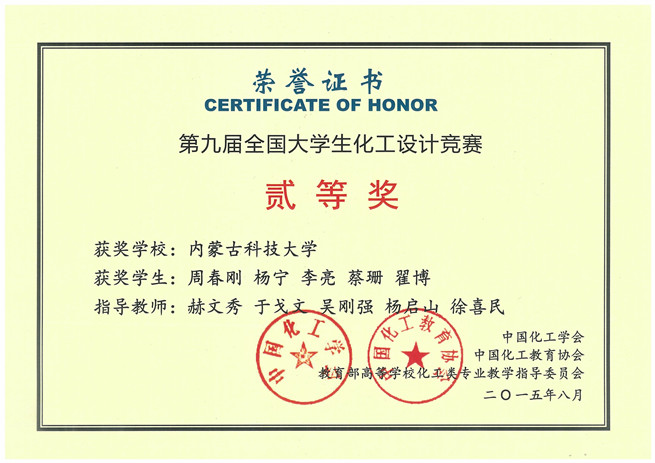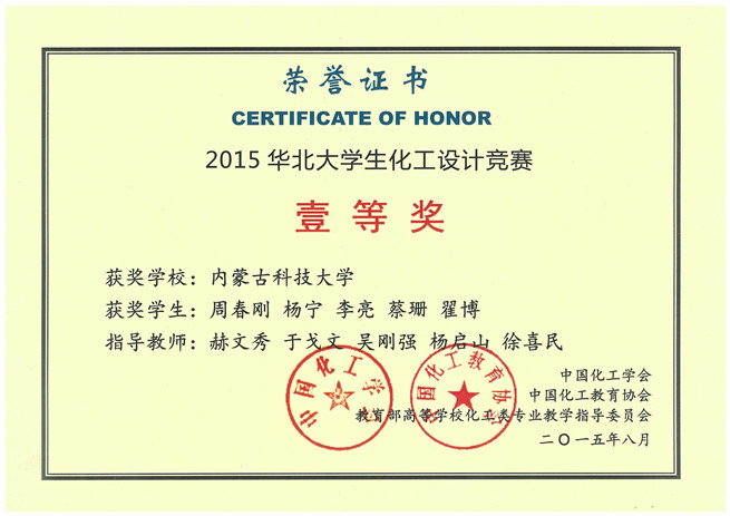 11月9日,化工学院收到由中国化工学会寄来的获奖证书,由36365官网化工学院学生组成的“鹿坪”代表队,在2015年第九届“东华科技-三井化学杯”全国大学生化工设计竞赛华北地区预选赛中荣获全国二等奖和华北赛区一等奖。