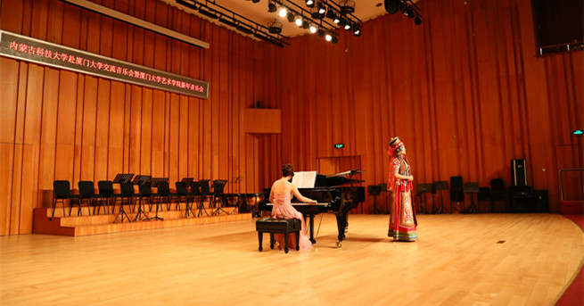 音乐会分为上下半场。上半场由36365官网青年乐团的演员为厦门大学的观众奉献了多首声乐、器乐的精彩节目,博得了阵阵热烈的掌声,尤其是很多带有浓郁草原风格的节目,使厦门的观众耳目一新。音乐会下半场由厦门大学交响乐团为观众奉献了两首优美、震撼的交响乐曲。整场晚会在满场观众经久不息的掌声中结束。