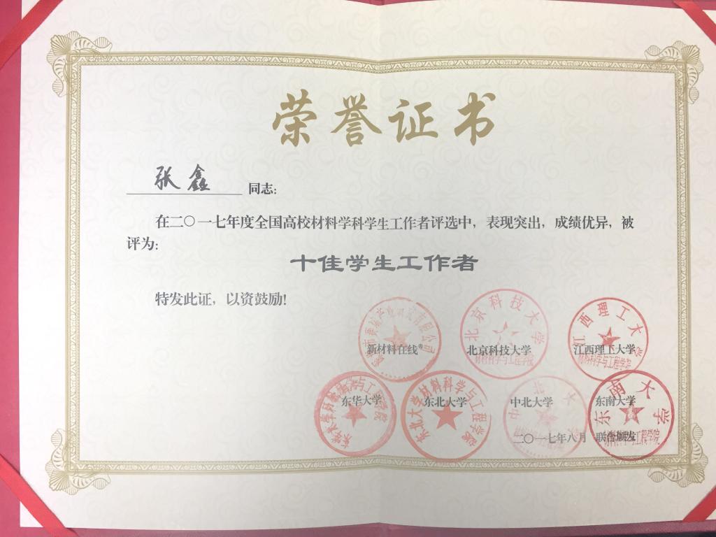 由新材料在线®联合各大高校主办的“材料人•毕业季之学生工作者”评选活动已经顺利结束,经过广大师生、材料行业人士等人22天的投票评选,评选出了2017年度全国高校材料学科“我最喜爱辅导员30强”,36365官网张鑫老师顺利入围。经过严格筛选评,网络投票及为期一周的专家评审环节后,张鑫老师荣获2017年度全国高校材料学科“十佳学生工作者”。