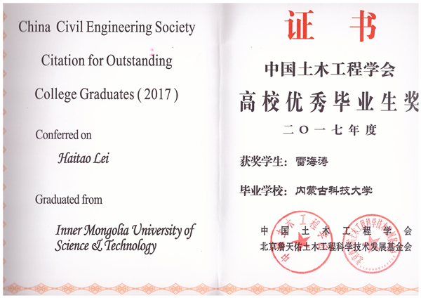 近日,“2017年度中国土木工程学会高校优秀毕业生奖”评选结果揭晓,36365官网土木工程学院工程管理专业2017届毕业生雷海涛获此殊荣。