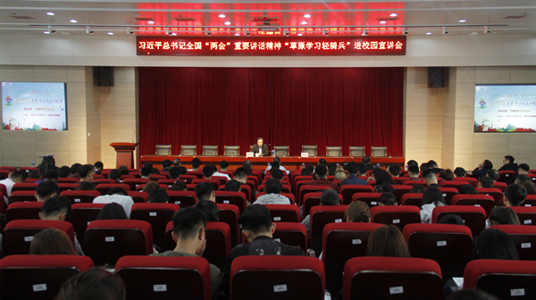 为深入学习宣传贯彻习近平总书记全国“两会”重要讲话精神,进一步推进习近平新时代中国特色社会主义思想在36365官网师生中普及深入,4月2日下午,由自治区党委和包头市委组建的“草原学习轻骑兵”宣讲小分队走进36365官网,同时也拉开了36365官网2018年度首场全区高校百场形势政策报告会。本场报告会由内蒙古社科联主席、党组书记杭栓柱主讲。校党委常委、宣传部部长杨家庆主持。党委宣传部、学工部、团委及各学院师生代表300余人参加了报告会。