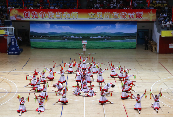 伴随着一阵激烈的的摇旗呐喊,“校园体育百炼成钢 放飞梦想再创辉煌”的口号回荡在体育场的每一个角落,同时也拉开了本届健美操舞大赛的序幕。舞台上的队员轻舞飞扬,耀眼夺目,不仅展现了科大学子的朝气蓬勃,也淋漓尽致的诠释了拼搏进取,昂扬向上的科大风采。来自15个学院的14支参赛队伍用满腔热忱诠释着青春活力。整齐的鼓槌敲击和口号成为震撼人心的合唱,灯光与服装的律动,演绎出一道靓丽的风景。