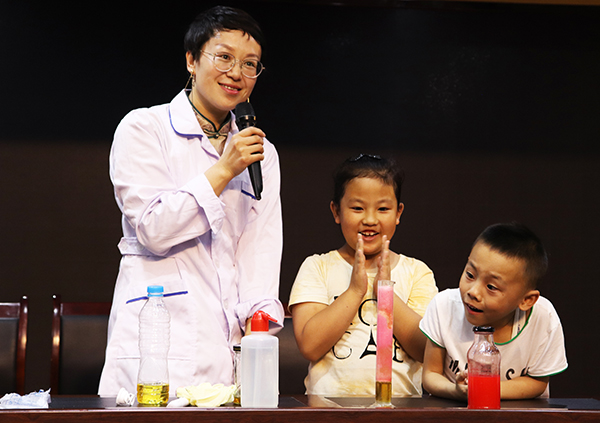 讲座中,欧阳顺利教授以“太阳光是什么颜色”为题进行发问,通过诱导式启发,说明太阳光通过光栅和三棱镜的颜色变化原理。欧阳教授深厚的专业基础和高超的启发技巧,使整个讲座变得深入浅出、通俗易懂,不禁让同学们联想到了彩虹的成色原理,现场气氛热烈、科普效果显著。李霞副教授则因材施教,根据小学生的知识储备情况,讲解了“红绿灯”实验。科普团队精心安排的科学实验课让现场热闹非凡,孩子们积极参与,收获颇丰。会后,两位老师愉快地接受了小学生记者团的采访。
