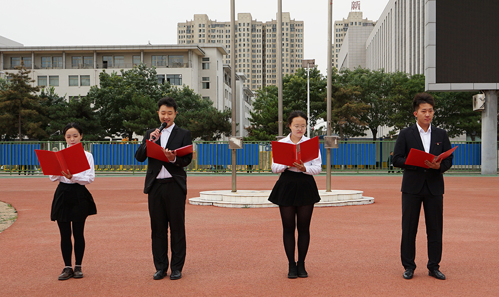 土木工程学院学生代表在国旗下朗诵《岁月筑基科大人,献礼祖国七十载》,句句有力,字字铿锵,表达了对祖国建国70周年的深深祝福与无限的敬意。