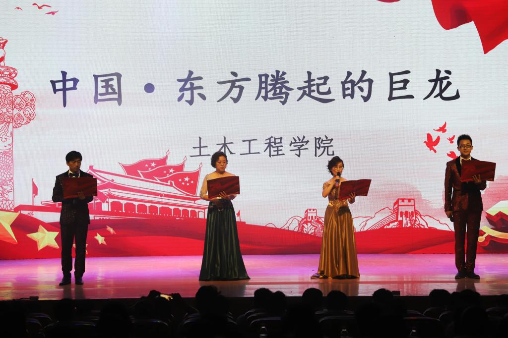 在悠扬的音乐中,《中国,上场》掀开了诵读会的篇章,鹿鸣呦呦献七十赞歌,诵声朗朗谱科大华章,土木工程学院教工代表满怀自豪,尽抒对祖国的肺腑真情。材料与冶金学院激情澎湃,欣望江山千里秀,骄傲诵读《我骄傲,我是中国人》,字字深情。机械工程学院诵读中将《红色十月》娓娓道来,让镰刀铁锤的岁月下的红色光芒闪耀在舞台上。应着活泼轻快的调子,化学与化工学院带来了《祖国颂》,歌颂着新时代下的幸福生活。理学院《祖国是什么》表达着对新中国深切的依恋之情。在朴素的陕西民谣中,招生就业处一首《回延安》通过朴实的字词追溯了红色的革命摇篮。土木工程学院带来的《中国,东方腾起的巨龙》回顾着祖国的艰苦历程,慷慨激昂地讲述70年来的春华秋实,日新月异。团委、学生工作部演绎的《我爱你,中国》,辅导员代表队诵读的《我的热爱大声说出来》、艺术与设计学院演绎的音乐诗《我爱您,祖国》,竞相表白祖国。国际学院带来的《春江花月夜》,团委的《诗意中国》捕捉着诗词中的浪漫中国,工程训练中心用蒙汉双语歌颂《美丽中国》,并表达爱国心。