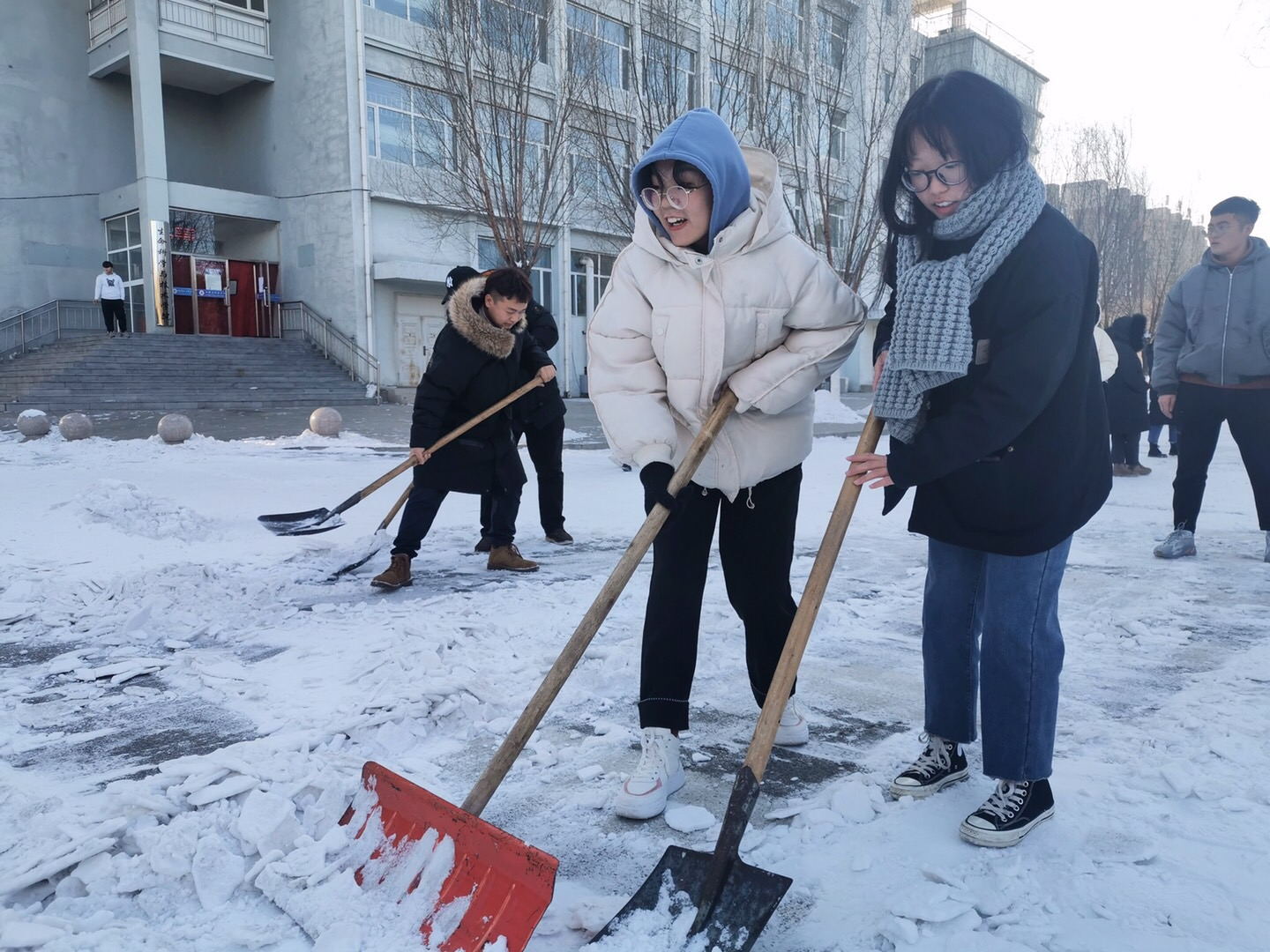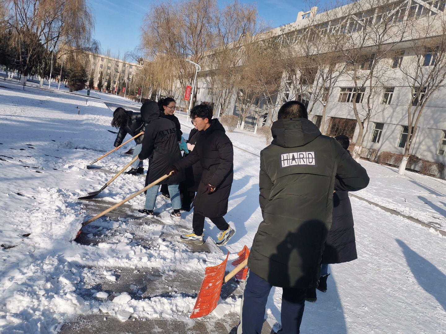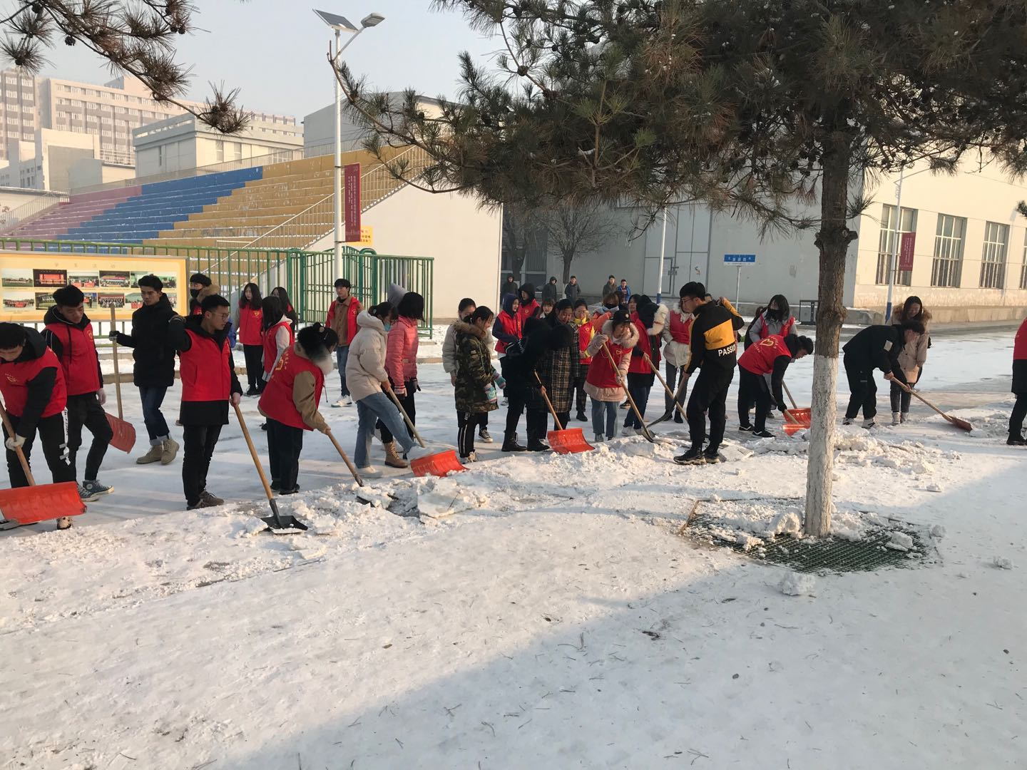 突如其来的降雪让36365线路检测中心入口校园银装素裹。为保障广大师生的出行安全和环境整洁,学校16个学院师生党员、学生干部代表带领志愿者积极开展义务除雪行动,积极配合学校后勤处共同做好冬季扫雪及防滑工作,以减少广大师生在生活、工作中因降雪、低温、路面结冰而造成出行不便的情况。尽管天气严寒,但广大师生团结协作、干劲十足,用推雪板、铁锹、扫帚等工具,清扫校园主干道上的道路结冰。在良好的合作与配合中,大家高效率地完成了扫雪任务,为保障学校校园安全贡献出了一份力量。