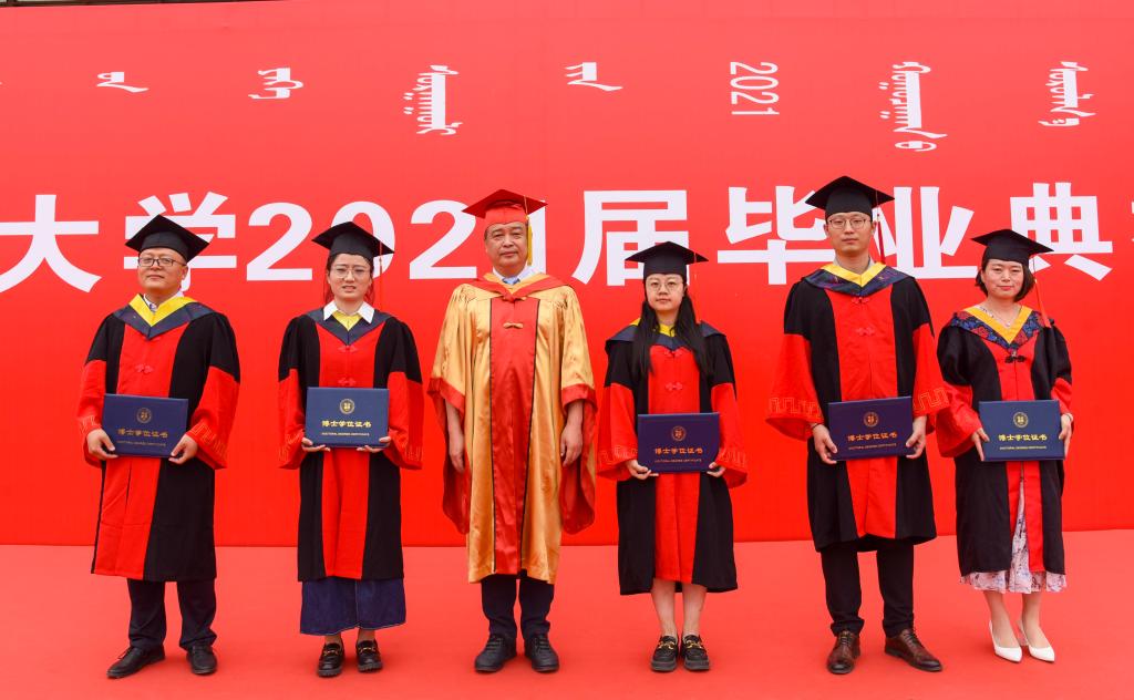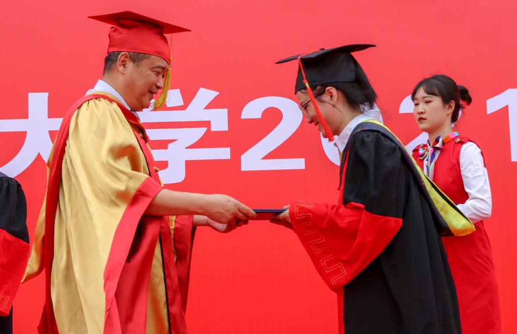 任慧平为获得博士学位的毕业生颁发学位证书。