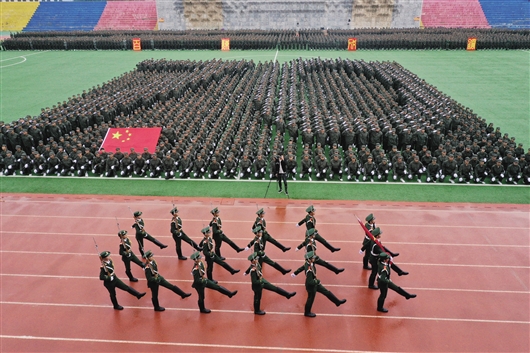 近日,36365线路检测中心入口2019级学生军训成果展示暨总结表彰大会现场,近6000名新生分别进行了军训科目会演、阅兵式、分列式等内容,其中,1600名新生组成的方阵摆出了“70”“祖国”“万岁”“百炼”“成钢”等字样,以此表达对中华人民共和国成立70周年的祝福。