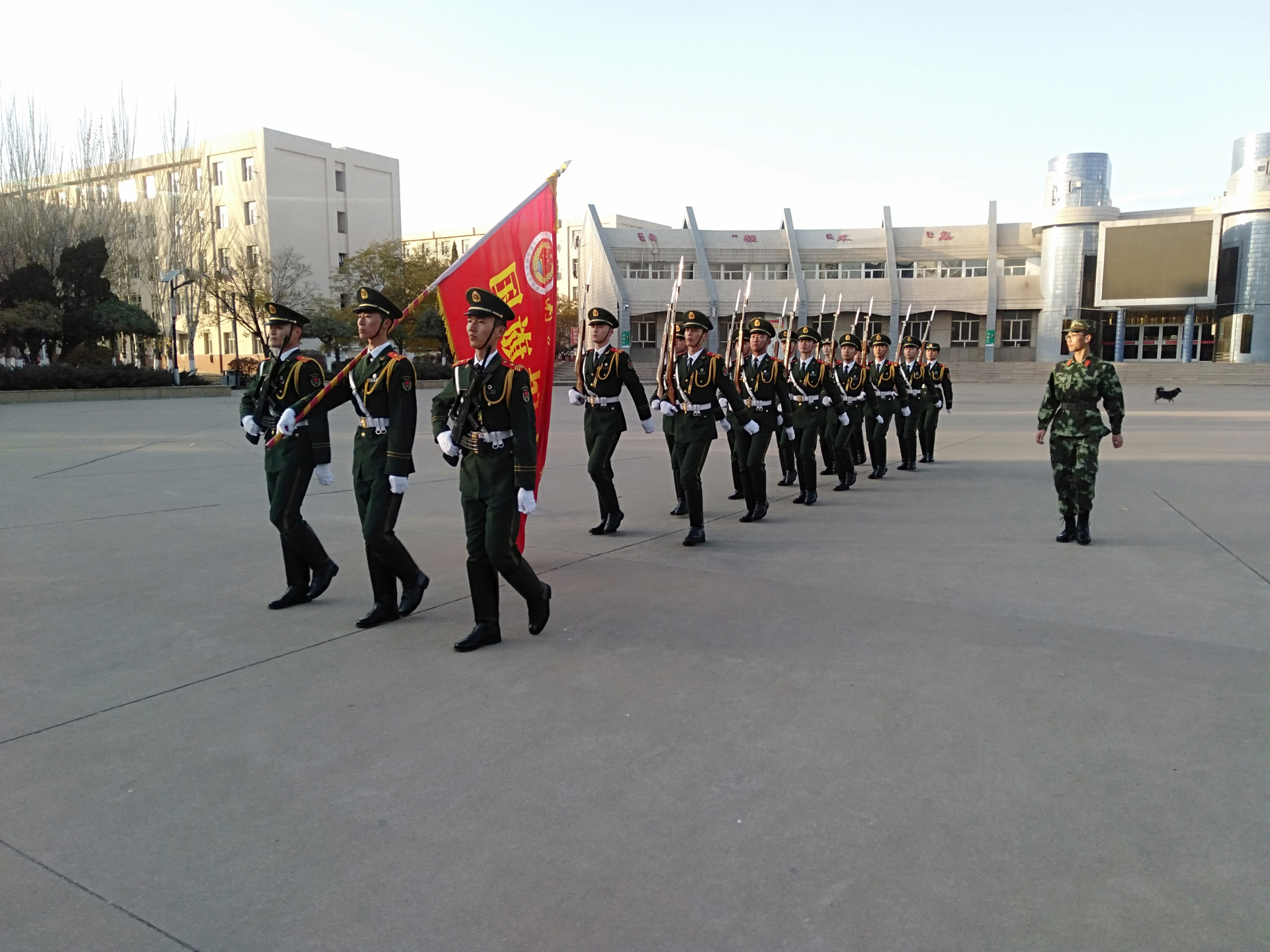 5时整,训练结束。国旗护卫队迈着整齐的步伐、喊着嘹亮的口号走向操场,进行每周日的大型降旗仪式。