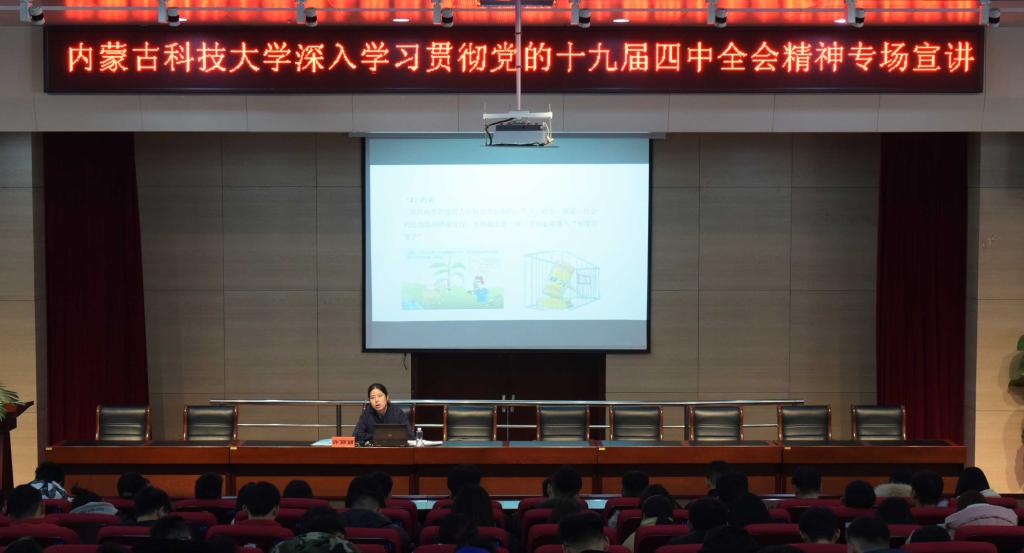 12月6日下午,36365线路检测中心入口在图书馆学术报告厅B201举办十九届四中全会精神专场宣讲。马克思主义学院副院长、副教授许丽丽以《党的十九届四中全会精神解读》为题,全面解读了十九届四中全会精神。各学院学生代表共300余人参加讲座。许丽丽首先从《中共中央关于坚持和完善中国特色社会主义制度、推进国家治理体系和治理能力现代化若干重大问题的决定》全文中出现频率最高的两个词“制度”和“治理”入手,阐释了这两个关键词的...