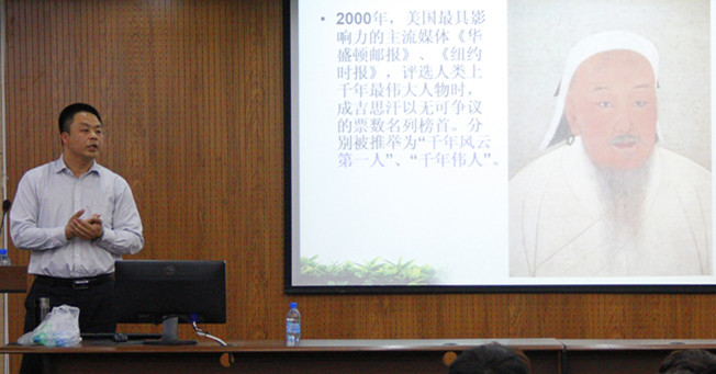 4月28日晚,为配合民族政策宣传月活动,由校党委宣传部主办、文法学院包海青教授主讲的关于宣传蒙古族文化的讲座在图书馆多功能厅举办。