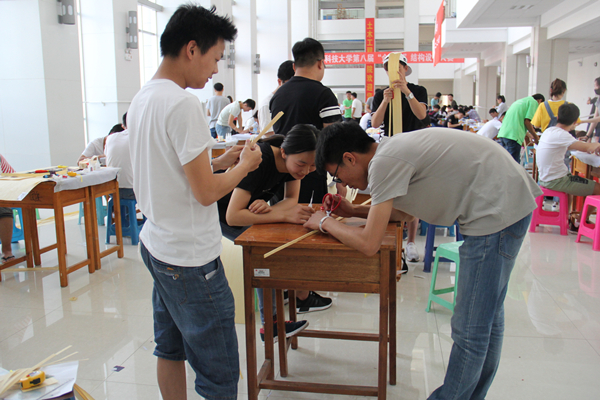 6月3日-4日,由校团委主办、土木工程学院承办的第八届“金鹰杯”结构设计大赛在逸夫楼一楼大厅举办。本次竞赛以扁担为原型,模拟两个人抬着重物通过一条崎岖的山路。以0.35mm厚的竹皮为主要制作材料,经过本组学生的讨论、实验最终确定出设计方案,并利用502胶水进行制作。竞赛预赛期间,共有来自全校6个学院从大一至大三的91支队伍参赛,最终有45组代表队成功进入决赛,并在规定的10小时内在逸楼大厅完成模型的制...